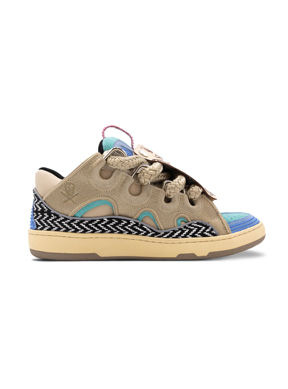 Through a symphony of intricate detailing, the design of the LANVIN Curb Sneaker by Surgeon combines traditional craftsmanship and embroidery with modern processes and techniques in homage to LANVIN’s couture heritage. The color palette pulls inspiration from both Los Angeles and Paris, blending soft hues of blues, tans, and beige, reminiscent of the California coastline where the sand meets the ocean. A pop of pink adds a playful element that rings true to Surgeon ethos bridging sophistication and trend.